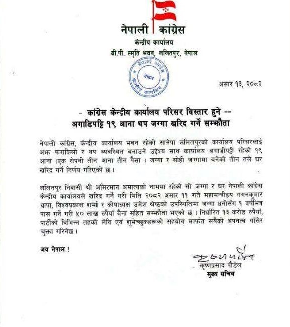 कांग्रेसले सानेपाको केन्द्रीय कार्यालय विस्तार गर्ने, १३ करोड लागतको नयाँ घर र जग्गा खरिद
