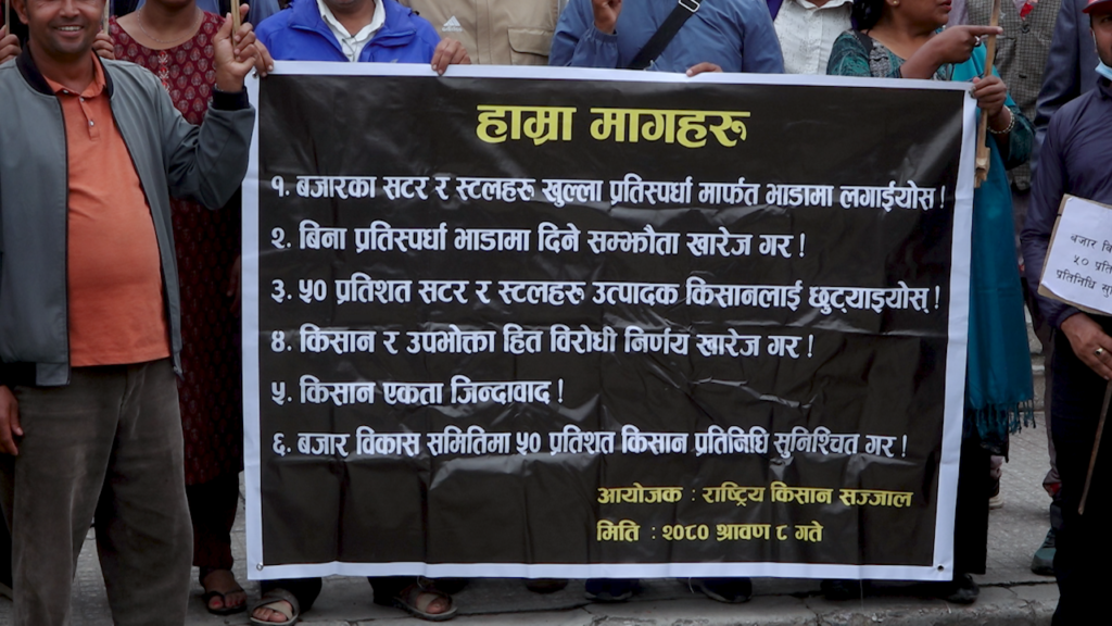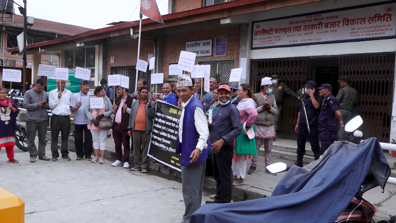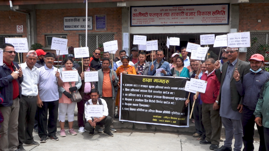 किसान सञ्जालद्वारा कालीमाटी बजार समितिमा धर्ना, ५० प्रतिशत सटर किसानलाई छुट्याउन माग
