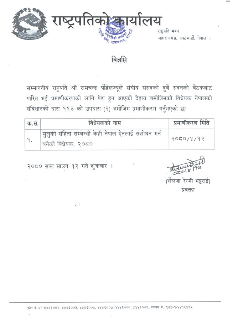 दुवै सदनबाट पारित भएर आएपछि राष्ट्रपति पौडेलले आज विधेयक प्रमाणीकरण गरेका हुन् । नेपालको संविधानको धारा ११३ को उपधारा (२) बमोजिम विधेयक राष्ट्रपतिले प्रमाणीकरण गरेको राष्ट्रपति कार्यालयका प्रवक्ता शैलजा रेग्मी भट्टराईले जानकारी दिइन् ।