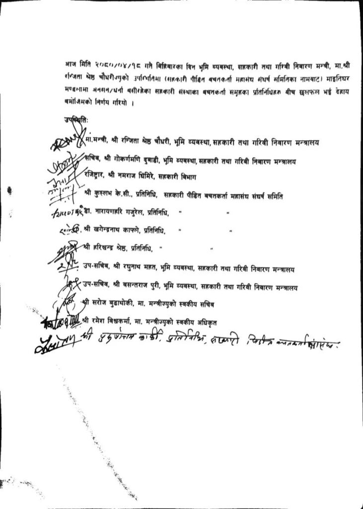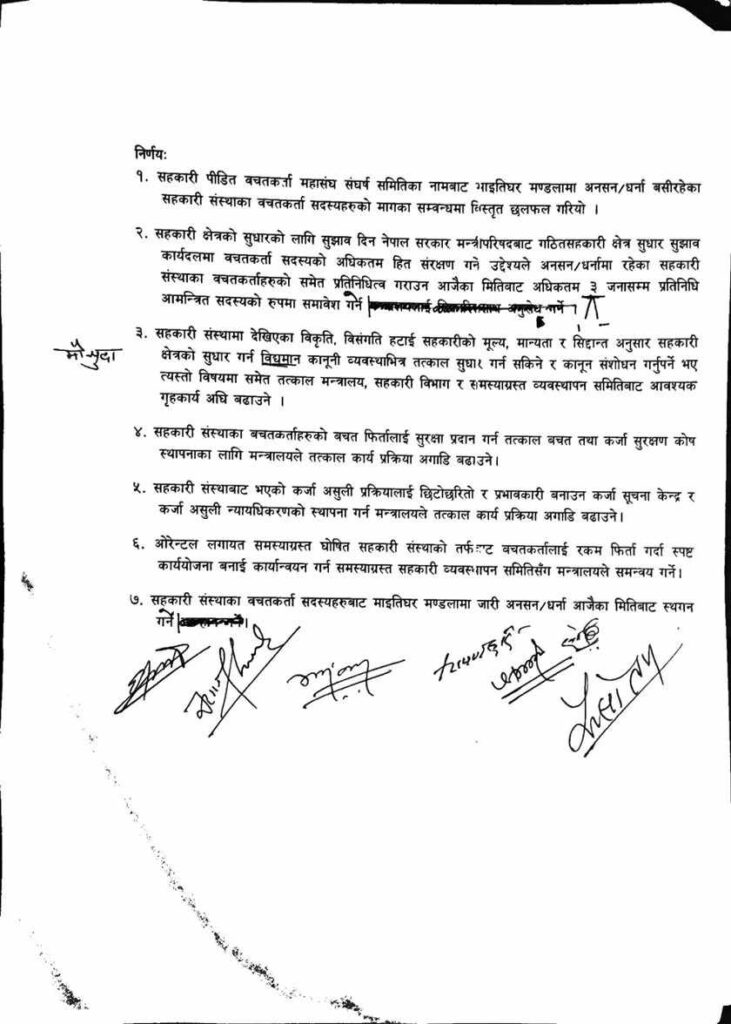 बिहीबार सिंहदरबारमा भएको छलफलमा सरकारसंग ७ बुँदे सहमति गरेपछि २ महिनादेखि आन्दोलनरत सहकारी पिडितले आन्दोलन स्थगित गर्ने भएका हुन् । सरकार र सहकारी पीडितबीच बचतकर्ताहरुको बचत फिर्तालाई सुरक्षा प्रदान गर्न तत्काल बचत तथा कर्जा सुरक्षण कोष स्थापनाका लागि कार्य प्रक्रिया अगाडि बढाउने सहमति भएको छ ।