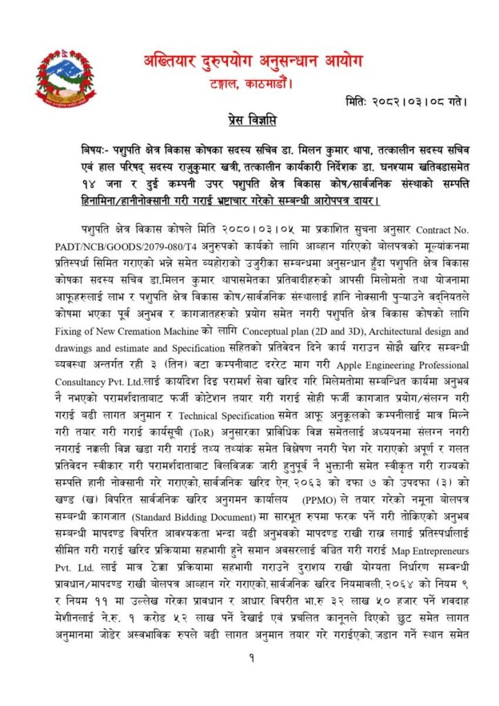 असार ८, २०८२ । पशुपति क्षेत्र विकास कोषमा भ्रष्टाचारको आरोप लागेका सदस्य सचिवसहित १४ जनाविरुद्ध अख्तियार दुरुपयोग अनुसन्धान आयोगले विशेष अदालतमा मुद्दा दायर गरेको छ ।