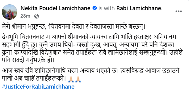 निकिताले लेखेकी छिन्, “मेरो श्रीमान् भन्नुहुन्छ– चितवनमा देवता र देवताजस्ता मान्छे बस्छन्। देवभूमि चितवनबाट म आफ्नै श्रीमान्को न्यायका लागि भोलि हस्ताक्षर अभियानमा सहभागी हुँदैछु।”