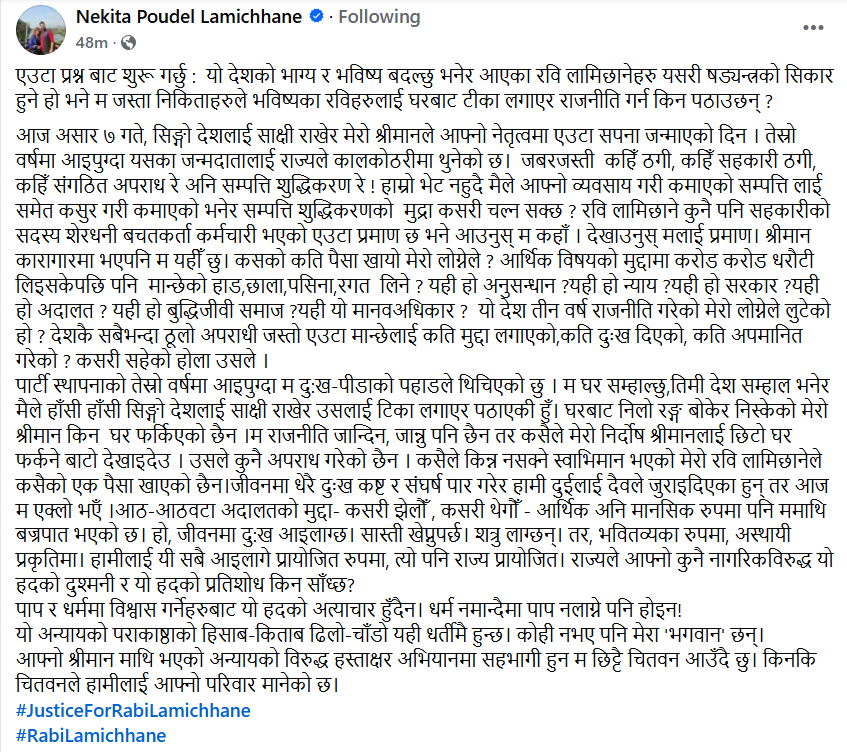 निकिताले सामाजिक सञ्जालमा लेखेकी यो अभिव्यक्तिपछि रविलाई समर्थन गर्ने अभियान फेरि तातिएको छ। #JusticeForRabiLamichhane ट्रेन्ड भइरहेका छन्।